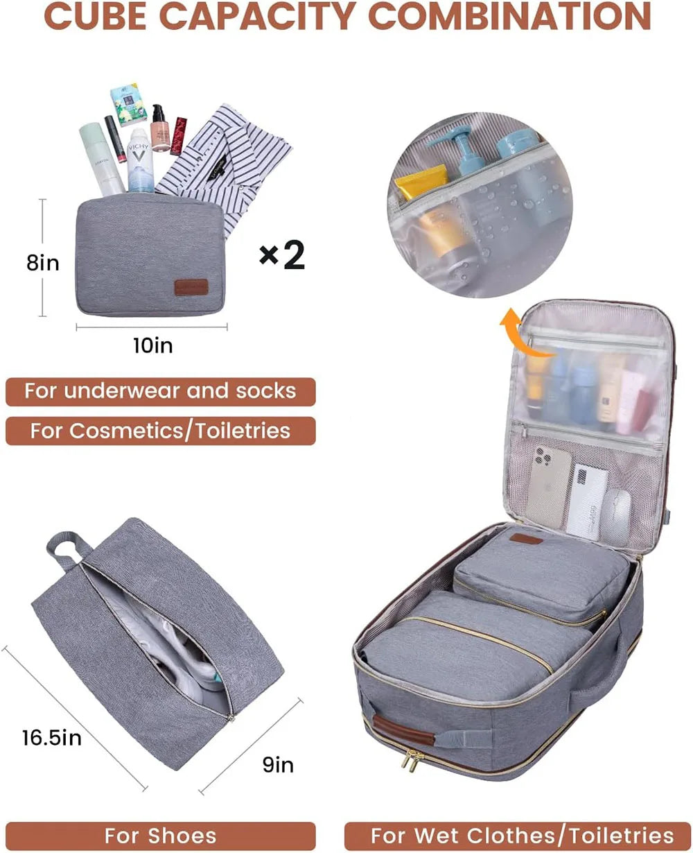 【3 Extra Packing Cubes & Wet Pockets】This carry-on bag includes 3 extra packing cubes – 2 storage bags and a shoe bag – as well as a built-in wet compartment pocket. Perfect for storing wet clothes, towels, and toiletries, these packing accessories ensure your belongings remain dry and prevent any leaks or moisture from affecting your other items.